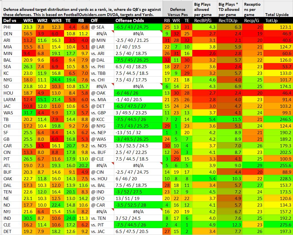 - Looking at the "defense vs pos" column you can see where that defense is bleeding points. Then you can get more granular and use the 2nd, 3rd, 4th, 5th and 6th columns to see which receiver type is most advantageous.